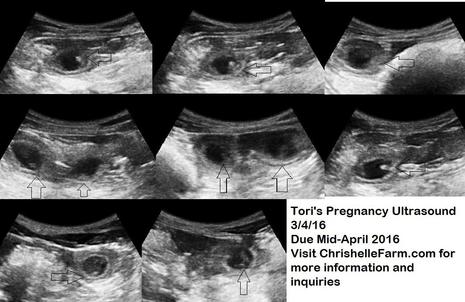 She showed no outside signs other than her temperament she was a little moody we saw at least 6 puppies. Ultrasound has the drawback of not being accurate to count puppies but can determine heartbearts in the puppies. Taken at 4 weeks the ultrasound image shows a gestational sac.