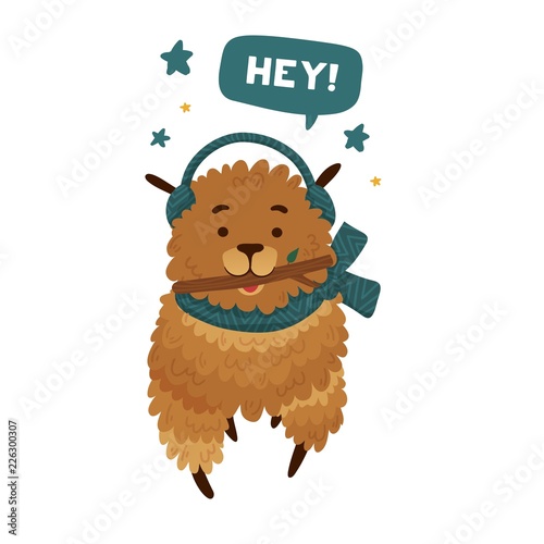 Print The Lovely Cartoon Dog With A Hat Scarf And Stick For