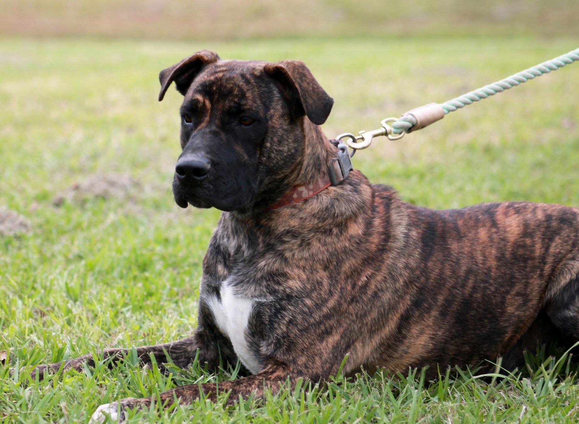 A Brindle Cane Corso American Bulldog Mixed Breed Dog